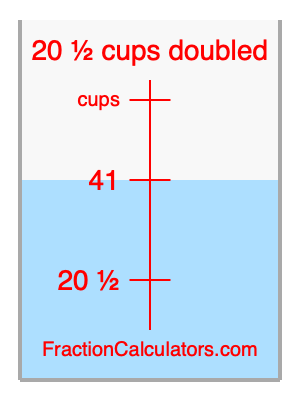 Here we will calculate 20 1/2 cups doubled and illustrate 20 1/2 cups doubled on a measuring cup. What is 20 1/2 cups doubled? 20 1/2 cups doubled is twice 20 1/2 cups. Therefore, to double 20 1/2 cups, we multiply 20 1/2 by 2. Here is the formula, the math, and the answer to 20 1/2 cups doubled:
