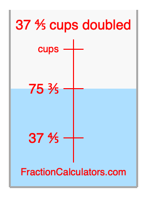 Here we will calculate 37 4/5 cups doubled and illustrate 37 4/5 cups doubled on a measuring cup. What is 37 4/5 cups doubled? 37 4/5 cups doubled is twice 37 4/5 cups. Therefore, to double 37 4/5 cups, we multiply 37 4/5 by 2. Here is the formula, the math, and the answer to 37 4/5 cups doubled: