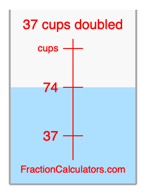 Here we will calculate 37 cups doubled and illustrate 37 cups doubled on a measuring cup. What is 37 cups doubled? 37 cups doubled is twice 37 cups. Therefore, to double 37 cups, we multiply 37 by 2. Here is the formula, the math, and the answer to 37 cups doubled: