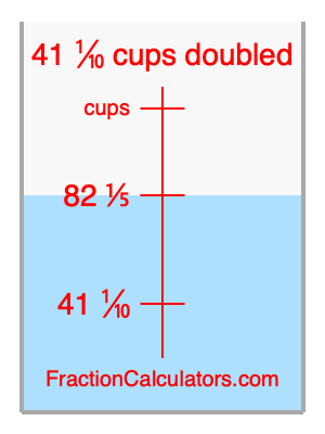 Here we will calculate 41 1/10 cups doubled and illustrate 41 1/10 cups doubled on a measuring cup. What is 41 1/10 cups doubled? 41 1/10 cups doubled is twice 41 1/10 cups. Therefore, to double 41 1/10 cups, we multiply 41 1/10 by 2. Here is the formula, the math, and the answer to 41 1/10 cups doubled: