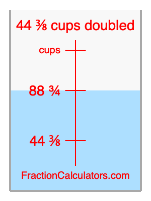 Here we will calculate 44 3/8 cups doubled and illustrate 44 3/8 cups doubled on a measuring cup. What is 44 3/8 cups doubled? 44 3/8 cups doubled is twice 44 3/8 cups. Therefore, to double 44 3/8 cups, we multiply 44 3/8 by 2. Here is the formula, the math, and the answer to 44 3/8 cups doubled: