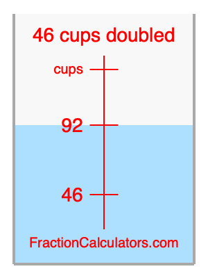 Here we will calculate 46 cups doubled and illustrate 46 cups doubled on a measuring cup. What is 46 cups doubled? 46 cups doubled is twice 46 cups. Therefore, to double 46 cups, we multiply 46 by 2. Here is the formula, the math, and the answer to 46 cups doubled: