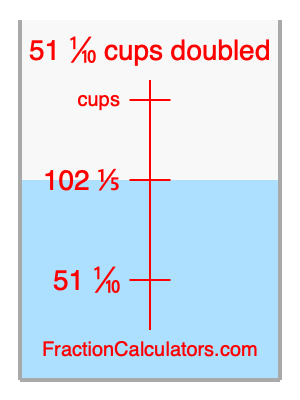Here we will calculate 51 1/10 cups doubled and illustrate 51 1/10 cups doubled on a measuring cup. What is 51 1/10 cups doubled? 51 1/10 cups doubled is twice 51 1/10 cups. Therefore, to double 51 1/10 cups, we multiply 51 1/10 by 2. Here is the formula, the math, and the answer to 51 1/10 cups doubled: