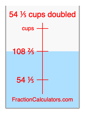 Here we will calculate 54 1/5 cups doubled and illustrate 54 1/5 cups doubled on a measuring cup. What is 54 1/5 cups doubled? 54 1/5 cups doubled is twice 54 1/5 cups. Therefore, to double 54 1/5 cups, we multiply 54 1/5 by 2. Here is the formula, the math, and the answer to 54 1/5 cups doubled: