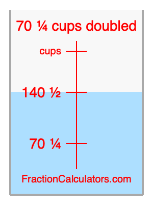 Here we will calculate 70 1/4 cups doubled and illustrate 70 1/4 cups doubled on a measuring cup. What is 70 1/4 cups doubled? 70 1/4 cups doubled is twice 70 1/4 cups. Therefore, to double 70 1/4 cups, we multiply 70 1/4 by 2. Here is the formula, the math, and the answer to 70 1/4 cups doubled: