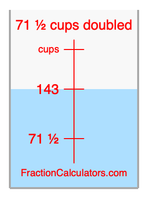 Here we will calculate 71 1/2 cups doubled and illustrate 71 1/2 cups doubled on a measuring cup. What is 71 1/2 cups doubled? 71 1/2 cups doubled is twice 71 1/2 cups. Therefore, to double 71 1/2 cups, we multiply 71 1/2 by 2. Here is the formula, the math, and the answer to 71 1/2 cups doubled:
