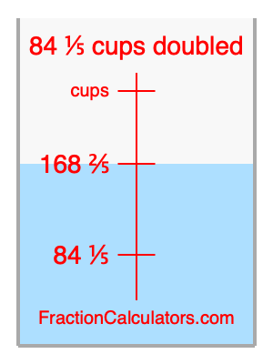 Here we will calculate 84 1/5 cups doubled and illustrate 84 1/5 cups doubled on a measuring cup. What is 84 1/5 cups doubled? 84 1/5 cups doubled is twice 84 1/5 cups. Therefore, to double 84 1/5 cups, we multiply 84 1/5 by 2. Here is the formula, the math, and the answer to 84 1/5 cups doubled:
