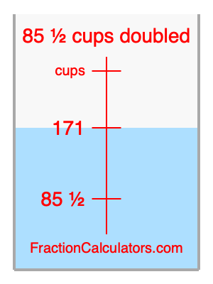 Here we will calculate 85 1/2 cups doubled and illustrate 85 1/2 cups doubled on a measuring cup. What is 85 1/2 cups doubled? 85 1/2 cups doubled is twice 85 1/2 cups. Therefore, to double 85 1/2 cups, we multiply 85 1/2 by 2. Here is the formula, the math, and the answer to 85 1/2 cups doubled: