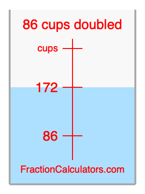 Here we will calculate 86 cups doubled and illustrate 86 cups doubled on a measuring cup. What is 86 cups doubled? 86 cups doubled is twice 86 cups. Therefore, to double 86 cups, we multiply 86 by 2. Here is the formula, the math, and the answer to 86 cups doubled: