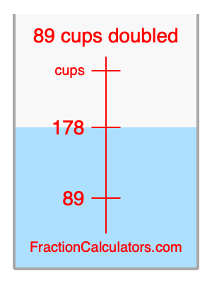 Here we will calculate 89 cups doubled and illustrate 89 cups doubled on a measuring cup. What is 89 cups doubled? 89 cups doubled is twice 89 cups. Therefore, to double 89 cups, we multiply 89 by 2. Here is the formula, the math, and the answer to 89 cups doubled: