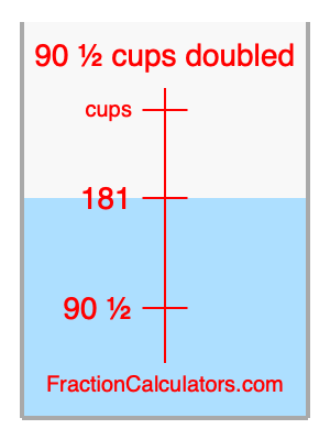 Here we will calculate 90 1/2 cups doubled and illustrate 90 1/2 cups doubled on a measuring cup. What is 90 1/2 cups doubled? 90 1/2 cups doubled is twice 90 1/2 cups. Therefore, to double 90 1/2 cups, we multiply 90 1/2 by 2. Here is the formula, the math, and the answer to 90 1/2 cups doubled: