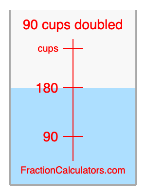 Here we will calculate 90 cups doubled and illustrate 90 cups doubled on a measuring cup. What is 90 cups doubled? 90 cups doubled is twice 90 cups. Therefore, to double 90 cups, we multiply 90 by 2. Here is the formula, the math, and the answer to 90 cups doubled:
