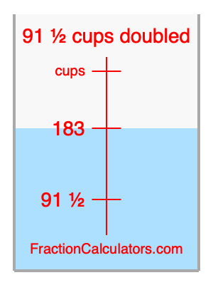 Here we will calculate 91 1/2 cups doubled and illustrate 91 1/2 cups doubled on a measuring cup. What is 91 1/2 cups doubled? 91 1/2 cups doubled is twice 91 1/2 cups. Therefore, to double 91 1/2 cups, we multiply 91 1/2 by 2. Here is the formula, the math, and the answer to 91 1/2 cups doubled:
