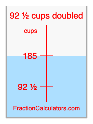Here we will calculate 92 1/2 cups doubled and illustrate 92 1/2 cups doubled on a measuring cup. What is 92 1/2 cups doubled? 92 1/2 cups doubled is twice 92 1/2 cups. Therefore, to double 92 1/2 cups, we multiply 92 1/2 by 2. Here is the formula, the math, and the answer to 92 1/2 cups doubled: