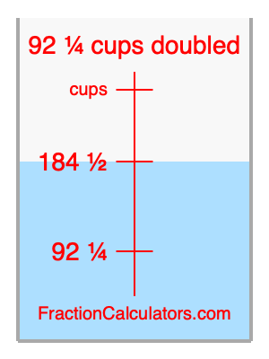 Here we will calculate 92 1/4 cups doubled and illustrate 92 1/4 cups doubled on a measuring cup. What is 92 1/4 cups doubled? 92 1/4 cups doubled is twice 92 1/4 cups. Therefore, to double 92 1/4 cups, we multiply 92 1/4 by 2. Here is the formula, the math, and the answer to 92 1/4 cups doubled: