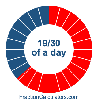 Here we will show you how to calculate exactly how many hours, minutes, and seconds there are in 19/30 of a day. We will also illustrate what 19/30 of a day looks like on a pie chart.