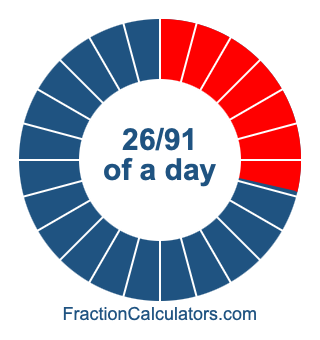 Here we will show you how to calculate exactly how many hours, minutes, and seconds there are in 26/91 of a day. We will also illustrate what 26/91 of a day looks like on a pie chart.