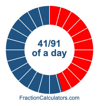 Here we will show you how to calculate exactly how many hours, minutes, and seconds there are in 41/91 of a day. We will also illustrate what 41/91 of a day looks like on a pie chart.