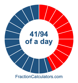 Here we will show you how to calculate exactly how many hours, minutes, and seconds there are in 41/94 of a day. We will also illustrate what 41/94 of a day looks like on a pie chart.