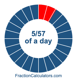 Here we will show you how to calculate exactly how many hours, minutes, and seconds there are in 5/57 of a day. We will also illustrate what 5/57 of a day looks like on a pie chart.