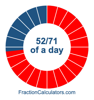 Here we will show you how to calculate exactly how many hours, minutes, and seconds there are in 52/71 of a day. We will also illustrate what 52/71 of a day looks like on a pie chart.