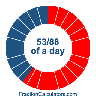 Here we will show you how to calculate exactly how many hours, minutes, and seconds there are in 53/88 of a day. We will also illustrate what 53/88 of a day looks like on a pie chart.