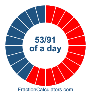 Here we will show you how to calculate exactly how many hours, minutes, and seconds there are in 53/91 of a day. We will also illustrate what 53/91 of a day looks like on a pie chart.