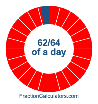 Below is a pie chart showing 62/64 of day. To create the image, we first colored the whole pie in blue, and then we covered 62/64 of it in red.