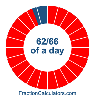 Here we will show you how to calculate exactly how many hours, minutes, and seconds there are in 62/66 of a day. We will also illustrate what 62/66 of a day looks like on a pie chart.