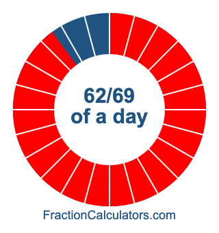 Here we will show you how to calculate exactly how many hours, minutes, and seconds there are in 62/69 of a day. We will also illustrate what 62/69 of a day looks like on a pie chart.