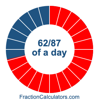 Here we will show you how to calculate exactly how many hours, minutes, and seconds there are in 62/87 of a day. We will also illustrate what 62/87 of a day looks like on a pie chart.