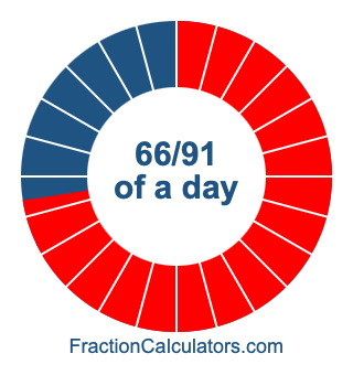 Here we will show you how to calculate exactly how many hours, minutes, and seconds there are in 66/91 of a day. We will also illustrate what 66/91 of a day looks like on a pie chart.
