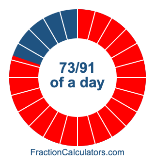 Here we will show you how to calculate exactly how many hours, minutes, and seconds there are in 73/91 of a day. We will also illustrate what 73/91 of a day looks like on a pie chart.