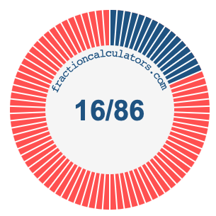 In addition, we will also illustrate the fraction 16/86 on a pie chart and 16/86 as a percent on a pie chart.