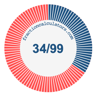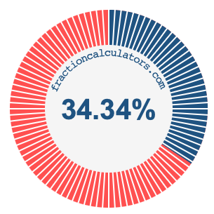 To find the percent in the equation above, we multiply 34 by 100 and then divide the product by 99. Here is the solution to the equation above and the answer to 34/99 as a percent: