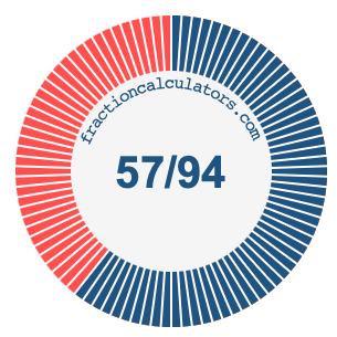 In addition, we will also illustrate the fraction 57/94 on a pie chart and 57/94 as a percent on a pie chart.
