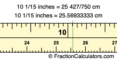 Centimeters is usually given in decimal form, so we have also converted the fractional answer to 10 1/15 inches to cm, to decimal form: