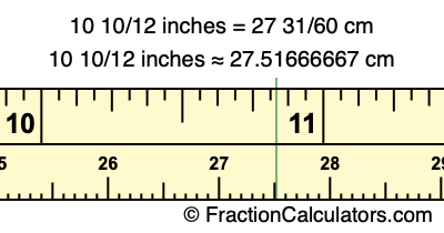 One inch is equal to 127/50 centimeters. Therefore, to get the fractional answer to 10 10/12 inches to cm, we multiply 10 10/12 inches by 127/50 and simplify if necessary.