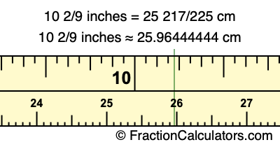 One inch is equal to 127/50 centimeters. Therefore, to get the fractional answer to 10 2/9 inches to cm, we multiply 10 2/9 inches by 127/50 and simplify if necessary.