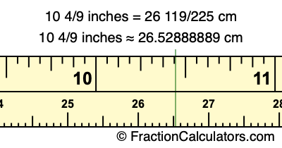 One inch is equal to 127/50 centimeters. Therefore, to get the fractional answer to 10 4/9 inches to cm, we multiply 10 4/9 inches by 127/50 and simplify if necessary.