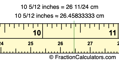 Here is how to convert 10 5/12 inches to cm. We will give you the fractional answer, the decimal answer, and illustrate the answer on our tape measure.