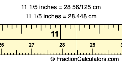 Centimeters is usually given in decimal form, so we have also converted the fractional answer to 11 1/5 inches to cm, to decimal form: