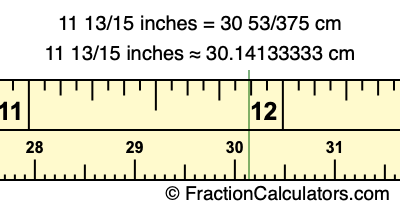 Centimeters is usually given in decimal form, so we have also converted the fractional answer to 11 13/15 inches to cm, to decimal form: