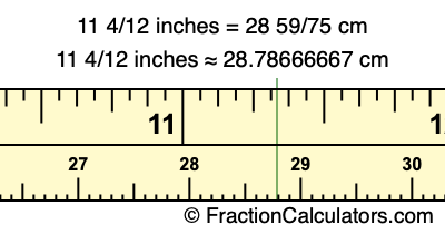 Here is how to convert 11 4/12 inches to cm. We will give you the fractional answer, the decimal answer, and illustrate the answer on our tape measure.