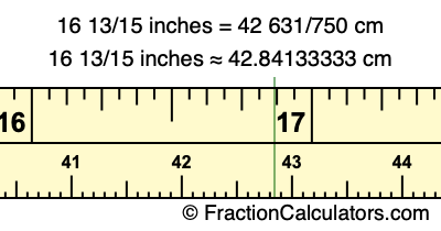 Centimeters is usually given in decimal form, so we have also converted the fractional answer to 16 13/15 inches to cm, to decimal form: