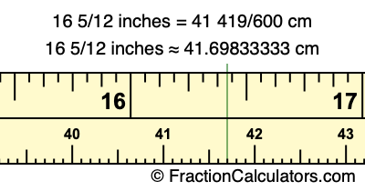 Centimeters is usually given in decimal form, so we have also converted the fractional answer to 16 5/12 inches to cm, to decimal form: