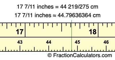 One inch is equal to 127/50 centimeters. Therefore, to get the fractional answer to 17 7/11 inches to cm, we multiply 17 7/11 inches by 127/50 and simplify if necessary.