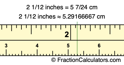One inch is equal to 127/50 centimeters. Therefore, to get the fractional answer to 2 1/12 inches to cm, we multiply 2 1/12 inches by 127/50 and simplify if necessary.