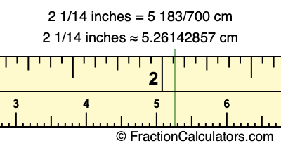 One inch is equal to 127/50 centimeters. Therefore, to get the fractional answer to 2 1/14 inches to cm, we multiply 2 1/14 inches by 127/50 and simplify if necessary.
