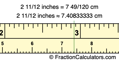 One inch is equal to 127/50 centimeters. Therefore, to get the fractional answer to 2 11/12 inches to cm, we multiply 2 11/12 inches by 127/50 and simplify if necessary.